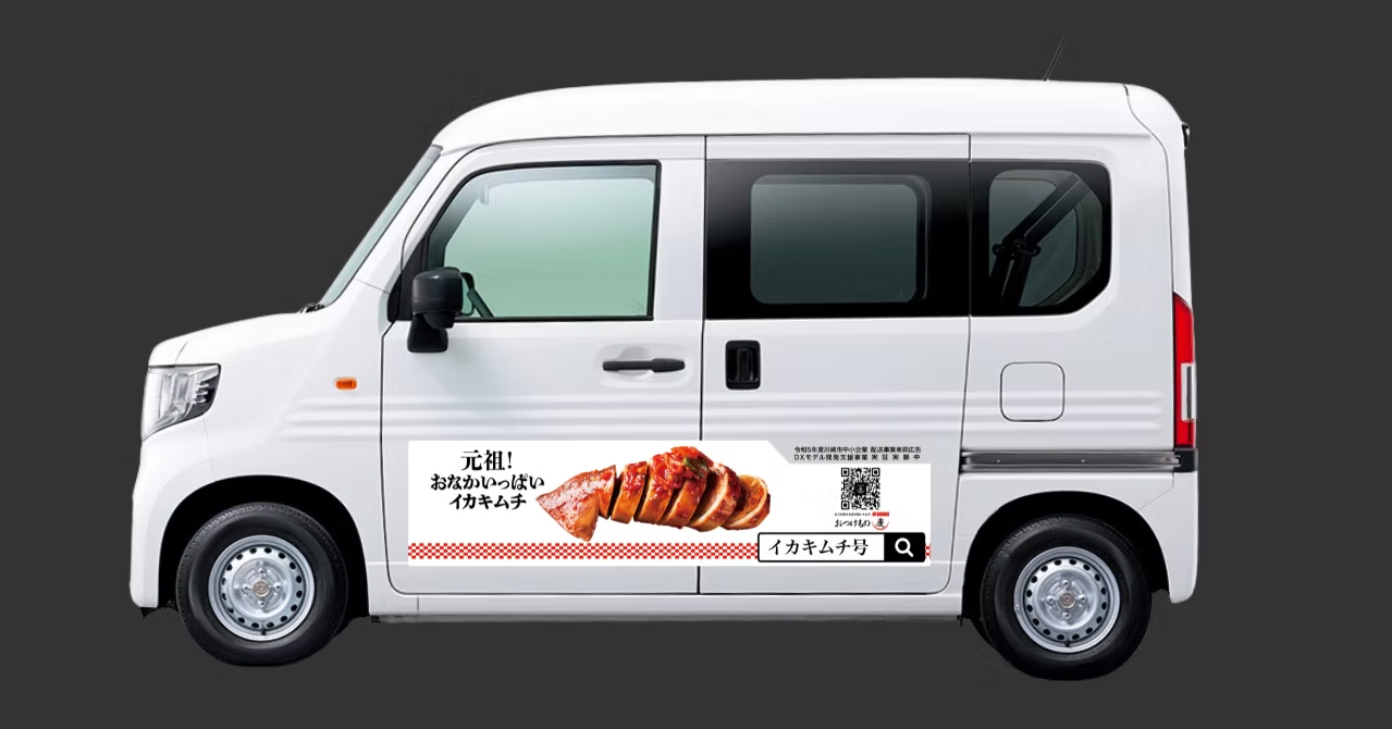 その中で、おつけもの慶と連携し、トラックや軽貨物配送車の広告掲載の価値推定に向けた実証に取り組むこととなりました。おつけもの慶のトラックや、地域配送の軽貨物配送車の荷台に広告を掲載して走行させ、取得した位置情報や、人流データなどを活用し、広告が閲覧された場所や回数を可視化することで、広告の効果を測定します。今回は、川崎市全域でトラック、軽貨物配送車が「イカキムチ号」として走ります。